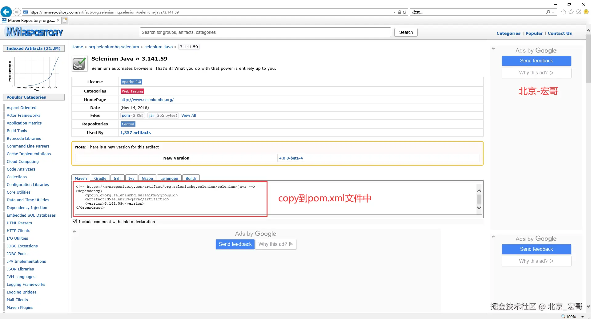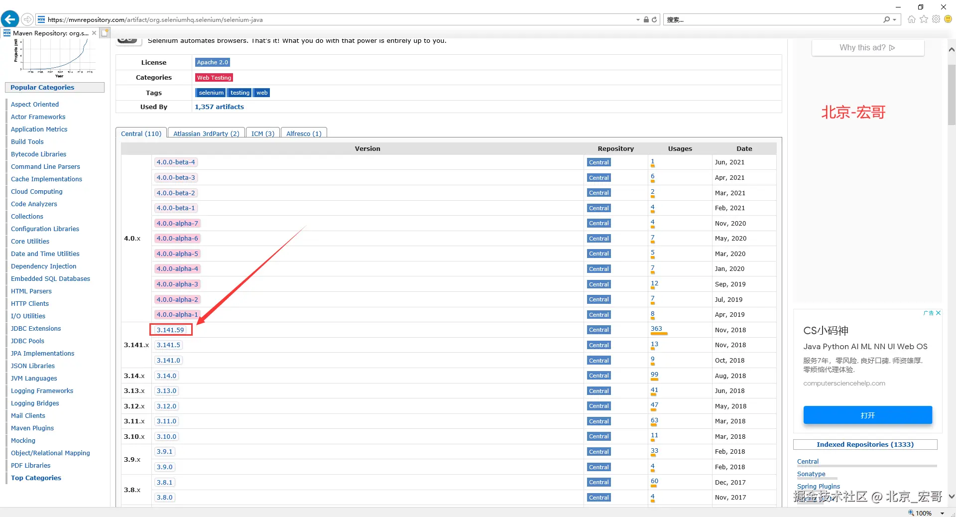 3.点击selenium java,查看自己需要的selenium版本,selenium我们都会选择最新的(宏哥这里用3.141.59举例一下),方便兼容最新的浏览器以及网络攻略……。如下图所示: