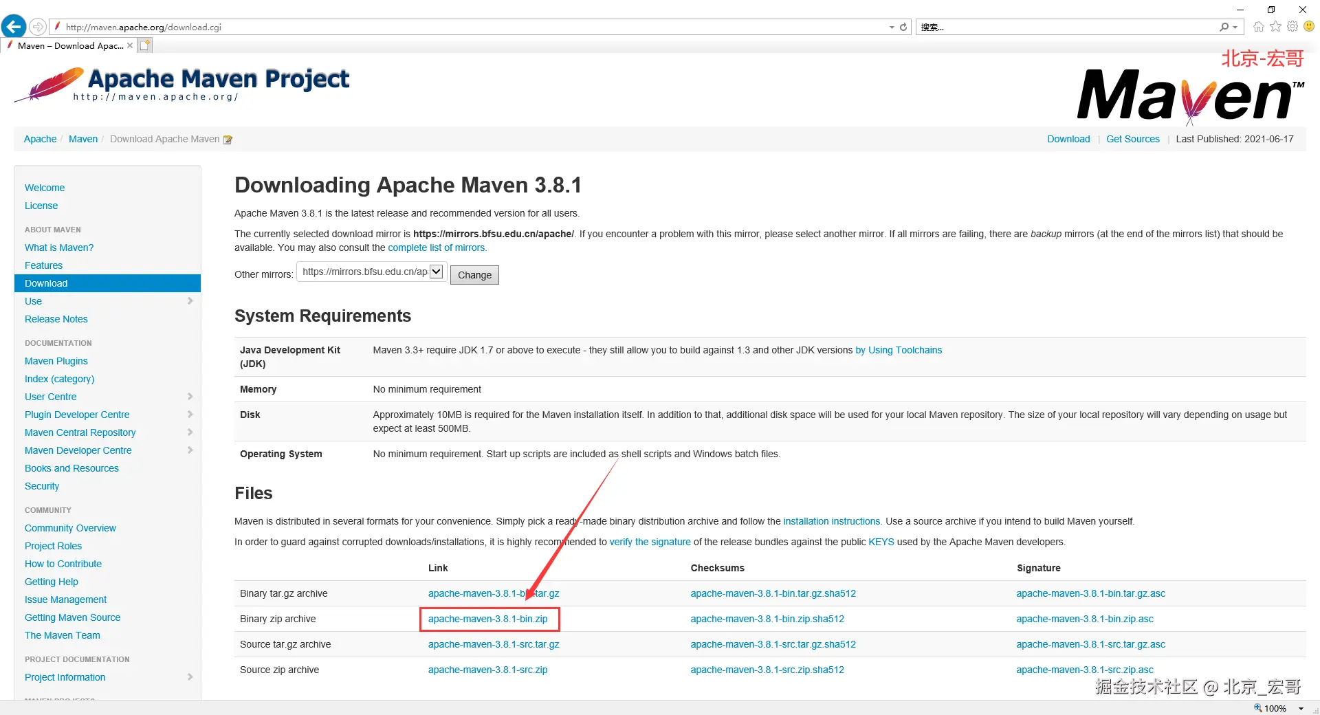 1.下载maven的bin,在apache官方网站可以下载。在Files下面下载对应的maven版本(官网的是最新版本),如下图所示: