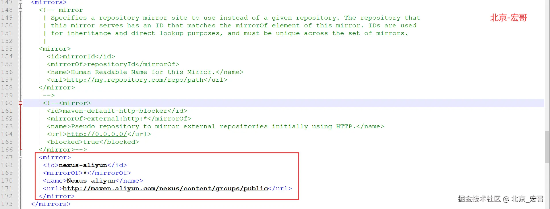 mirror相当于拦截器,将对远程仓库的请求重定向到mirror指定的地址,如上面的代码将对central的请求重定向到maven.aliyun.com/nexus/conte…