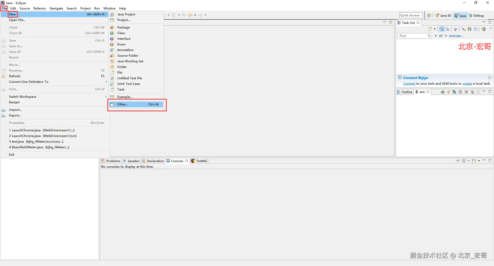 1.依次点击eclipse的file - new - other ,如下图所示: