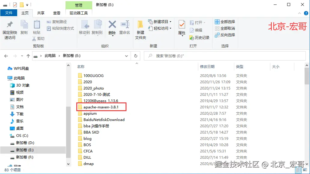 4.下载的apache-maven-3.8.1.zip不需要安装,只需解压即可,将apache-maven-3.8.1解压到E盘根目录下,放在你本地电脑磁盘空间比较充足的磁盘,宏哥放在E盘,并解压,如下图所示: