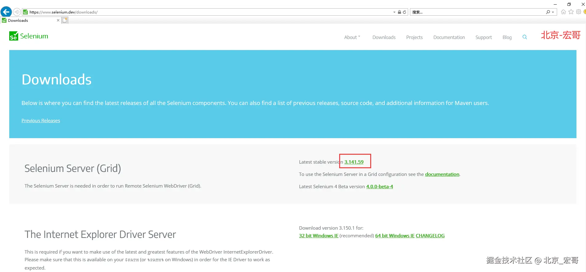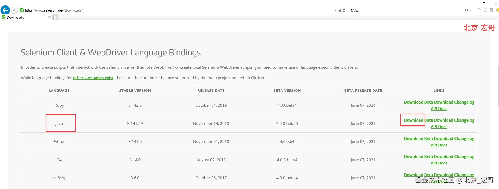 1、官方下载地址: www.seleniumhq.org/download/ 如果官方地址无法访问自己可以网上搜一下应该可以 轻松的下载到,如果实在找不到可以微信搜索“北京宏哥”公众号,关注宏哥以后进入公众号发送“jar包”来获取下载方法。进入官网找到页面和java语言,点击后边的download,如下图所示: