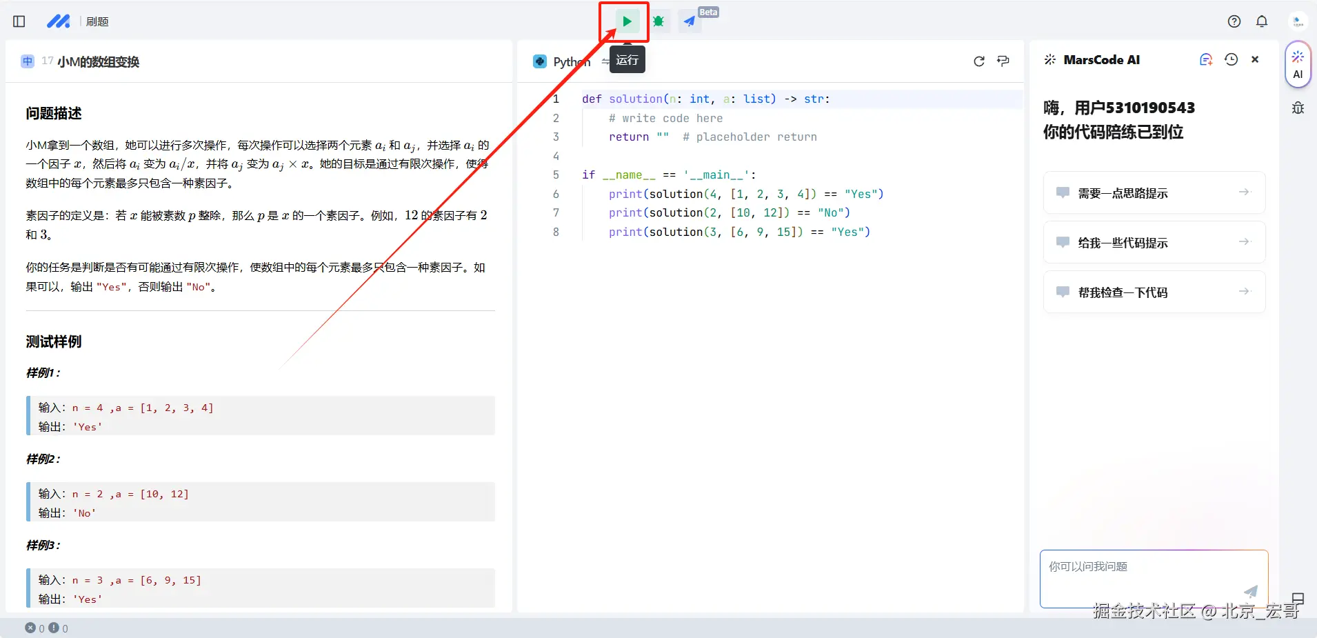 (3)进入题目详情内容,点击运行代码图标,即可刷题成功,获得投票次数,如下图所示: