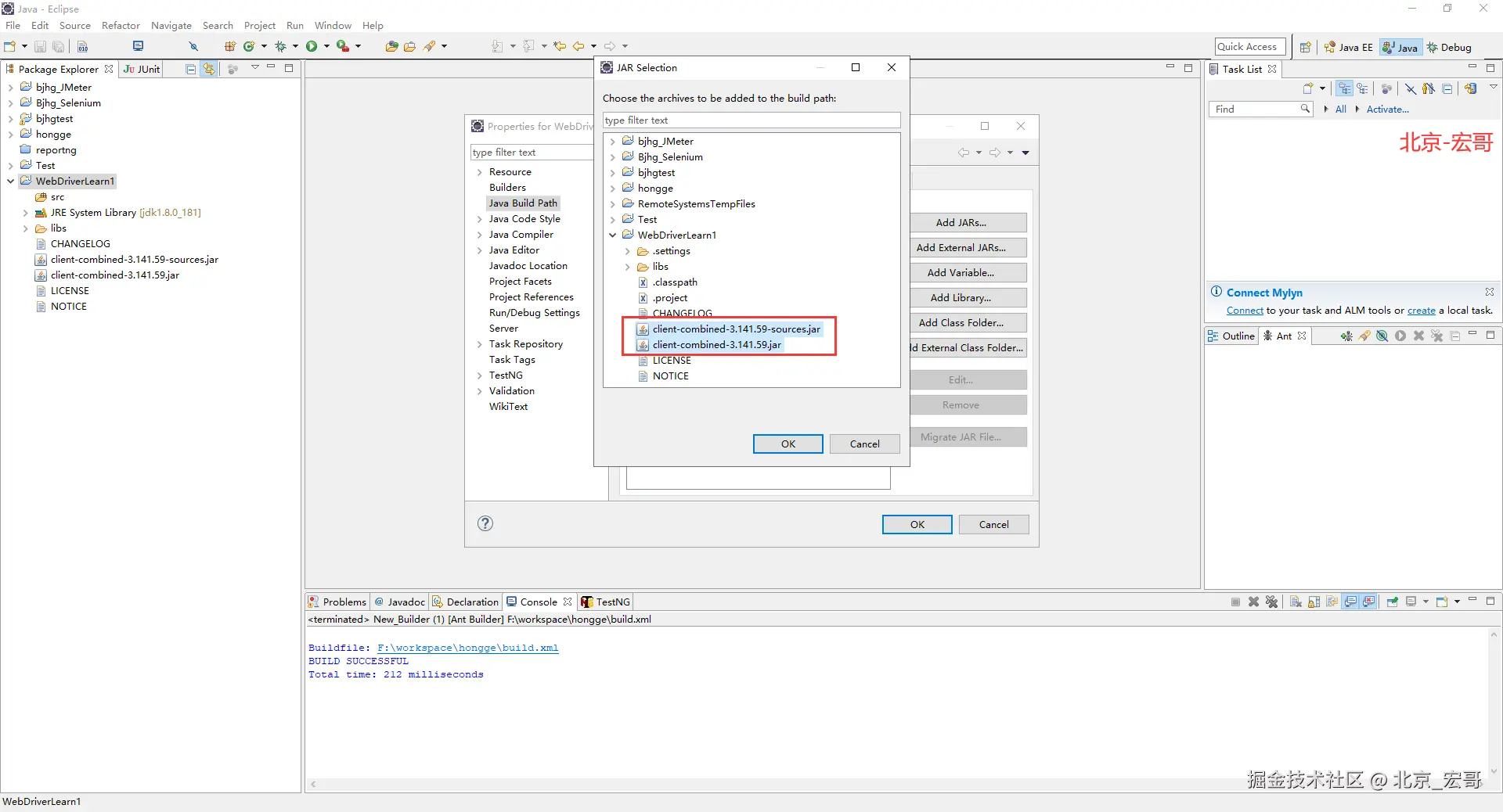 网上绝大多数的教程,按照方法一配置selenium 自动化测试环境,都是只让导入client-combined-3.141.59.jar和client-combined-3.141.59-sources.jar,没有说让导入lib 目录下的jar 包,宏哥也没仔细看,明明jar包都导入了啊,后实在看不出来原因,去看这个jar 包的时候,发现libs文件夹中这里面还有几个jar 包。好吧,导入就OK了。