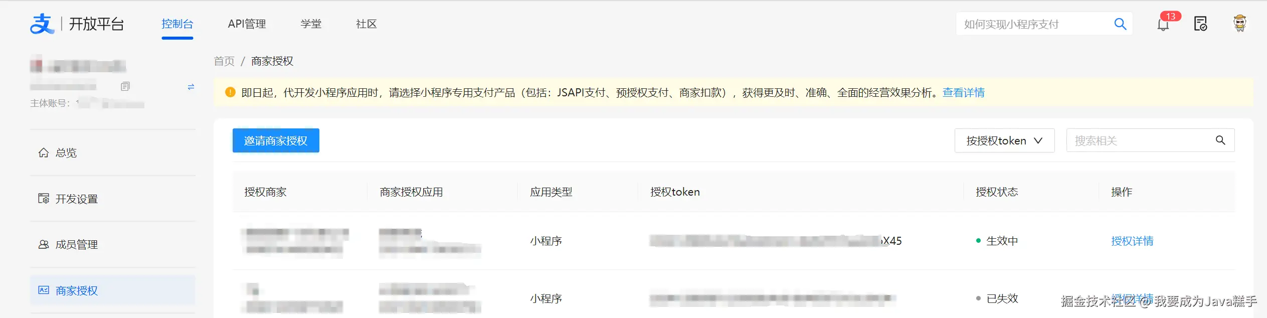 服务商只有一个小程序平台,商家收款都在这个小程序中支付的场景。服务商开发一个小程序应用 A 并上线,然后再创建一个第三方应用 B(可以是非小程序第三方应用),创建第三应用 B 后添加 JSAPI 支付产品和获取用户信息的功能,然后生成第三方授权链接让商家登录账号后授权给第三方应用 B。授权完成后通过第三方应用 B 的 APPID 和商家授权的 app_auth_token 在服务端调用 alipay.trade.create(统一收单交易创建接口),并在入参 op_app_id 中传入小程序经营主体 APPID(指在服务商小程序中,拉起收银台支付时,对应的小程序应用的 APPID,此场景应填入小程序应用 A),创建交易获取 tradeNO 参数,将 tradeNO 参数通过 my.request 接口传到小程序应用 A 中,用 my.tradePay 接口唤起支付,即可实现收款到商家账号中。 注意:上述开发过程中可能会遇到获取 user_id 授权问题,为方便接口调用,服务商需要再将自己的小程序应用 A 授权给自己的第三方应用 B,授权成功后也会获得代表小程序 A 的 app_auth_token。小程序应用 A 中用户授权产生的 auth_code 需要通过第三方应用 B 在 alipay.system.oauth.token(换取授权访问令牌) 接口换 auth_token,此接口调用的时候需要加上代表小程序 A 的 app_auth_token 调用才可以成功获取到 user_id,详情请查看 获取会员基础信息、三方应用授权。
