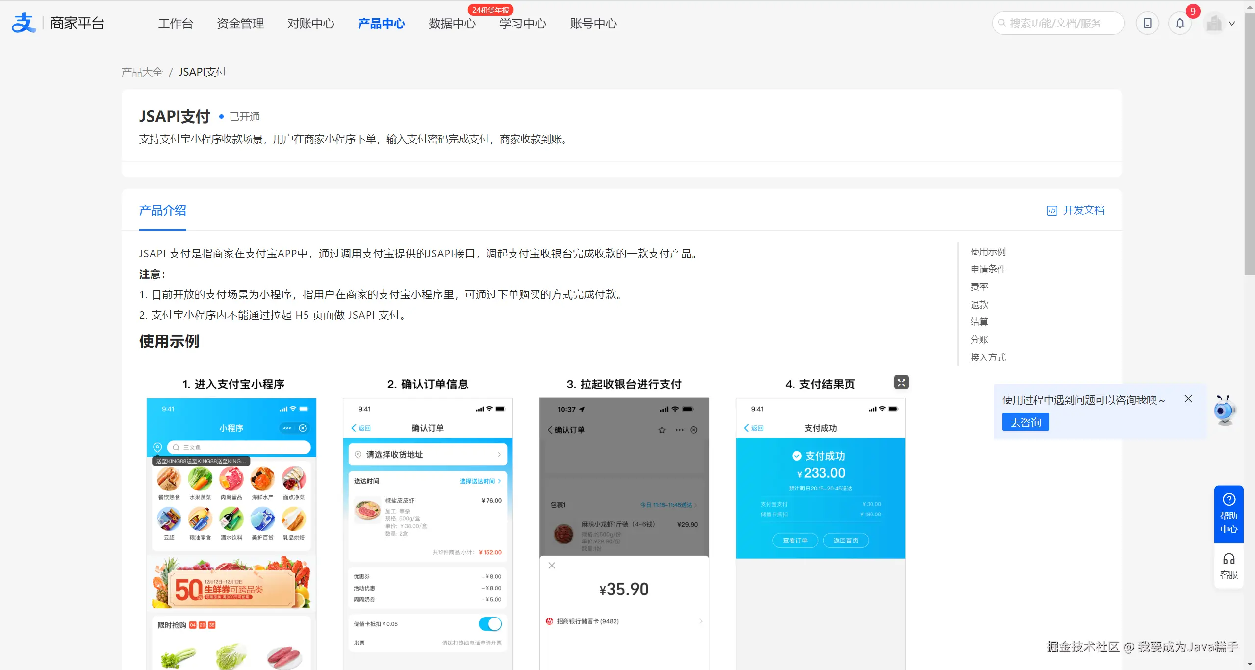 商户账号在 商家平台 > 产品中心 > 产品详情页面 点击 立即开通,填写并提交相关信息。详情可查看 开通产品。开通完成后请在产品详情页点击 管理小程序 APPID,关联绑定服务商拉支付的小程序应用 A。