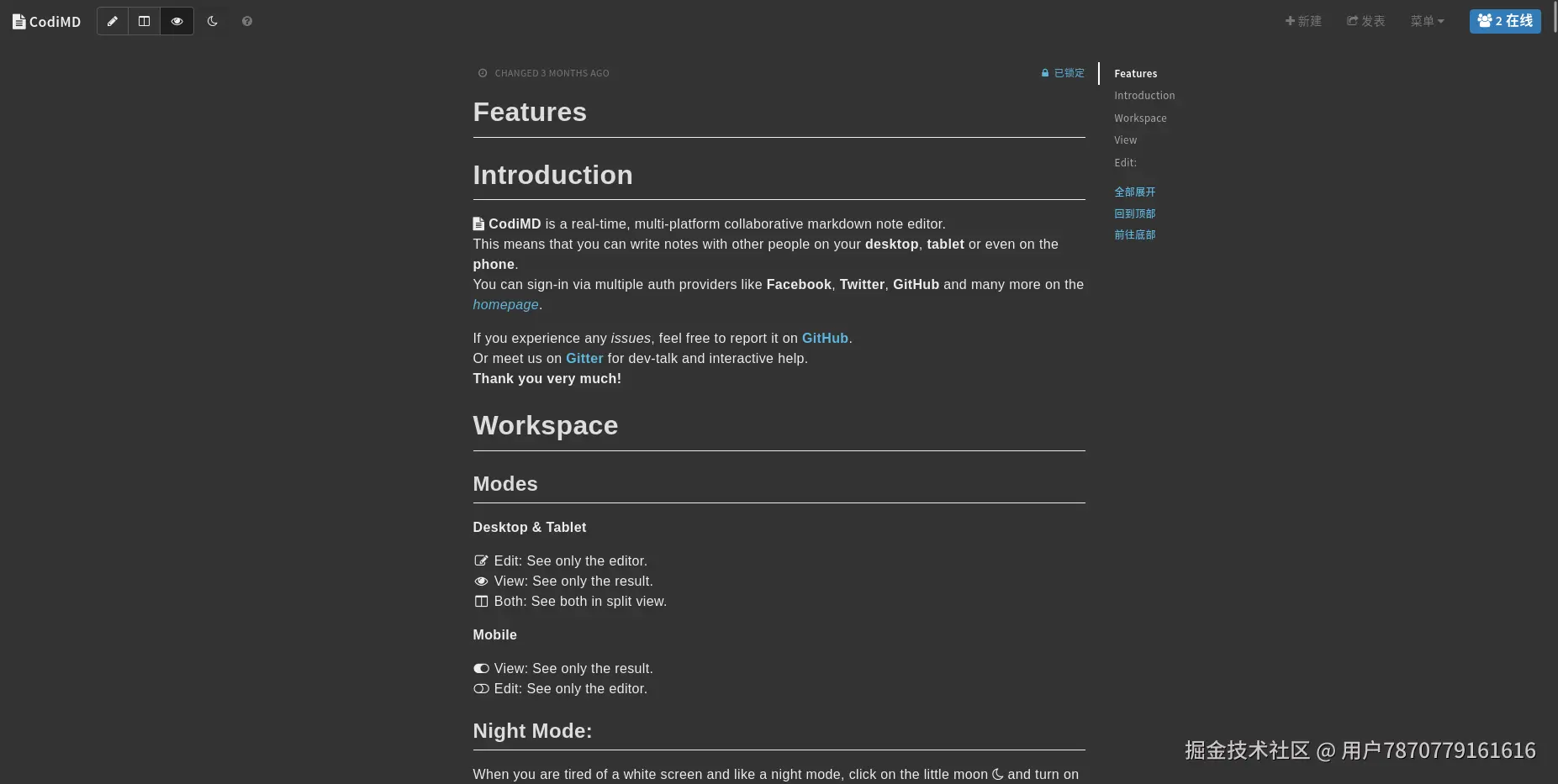 点击探索所有功能:这是一篇介绍 CodiMD 的介绍和功能点以及 markdwon 用法的官方文档,这个文档没有进行官方的翻译,所以都是英文,除了菜单是中文名。同时这也一个 CodiMD 的编辑界面,我们后续使用添加新 markdown 文档时候,编辑界面就是这个样子,右侧还显示文章目录