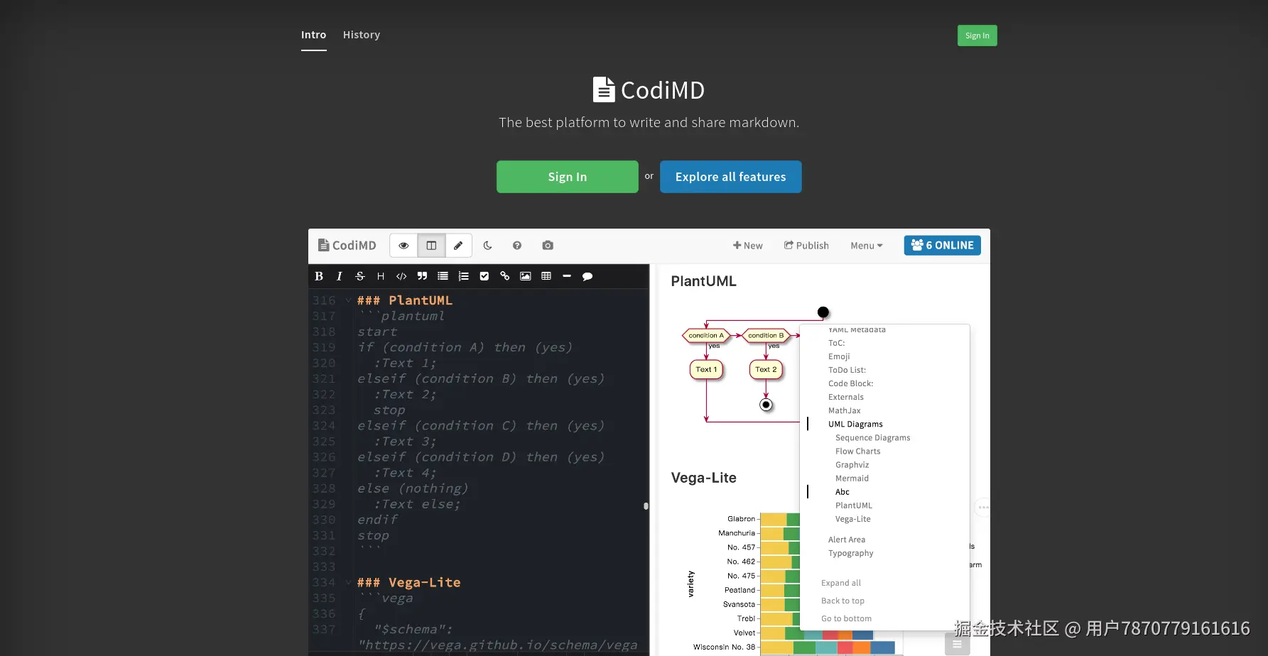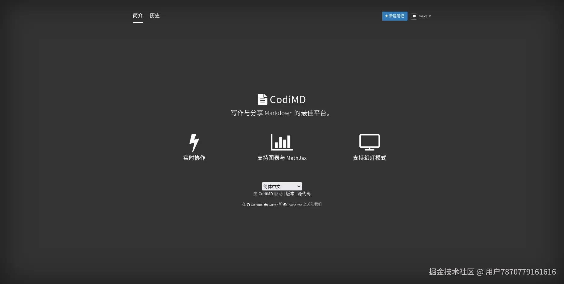 查看简介栏,CodiMD 的特点是实时协助、支持图表和MathJax、支持幻灯模式