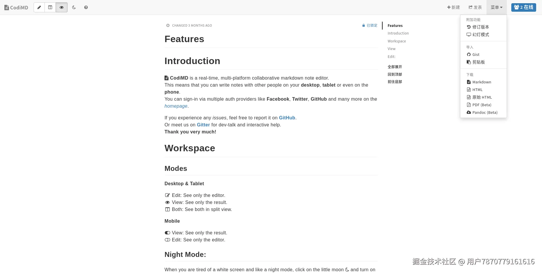 右上角的功能栏,包含新建、发表和附加功能、导入、下载(支持导出 markdown、HTML、PDF文件格式),还可以查看在线阅读这篇文档的人员