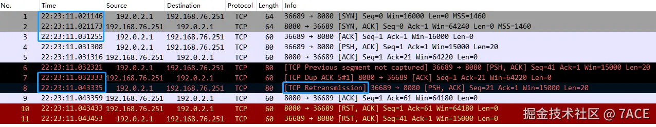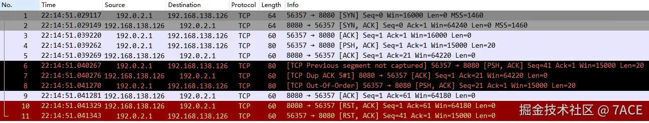 经 Wireshark 展示如下,可以看到满足判断条件后,No.8 标识 [TCP Out-Of-Order] ,是因为客户端发送的数据分段 No.6 Seq Num 41 和 No.4 Next Seq Num 21 之间缺少了一个长度为 20 字节的数据分段,No.6 标识为 [TCP Previous segment not captured] ,而 No.7 标识为 [TCP Dup ACK] ,紧接着之后的 No.8 Seq Num 21 + Len 20 数据包,标识为 [TCP Out-Of-Order]。