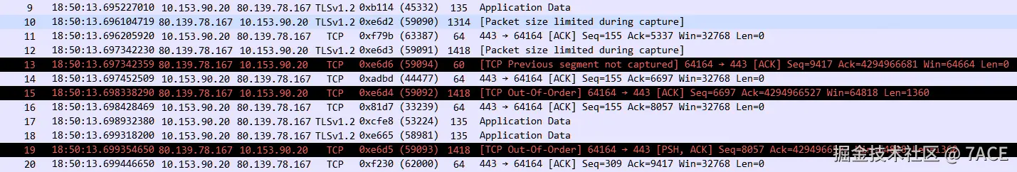 代码中描述的一系列乱序包被纯 ACK 分隔的场景,其中 No.13 为纯 ACK,No.15 为乱序的第一个数据包,它满足判断乱序代码中继续判断的第一种场景,nextseq != (seq + seglen),因此被标记为 [TCP Out-Of-Order],而 No.19 为乱序的第二个数据包,它满足判断乱序代码中继续判断的第二种场景,lastacklen = 0,因为 No.13 为纯 ACK,所以 No.19 也被标记为 [TCP Out-Of-Order]。