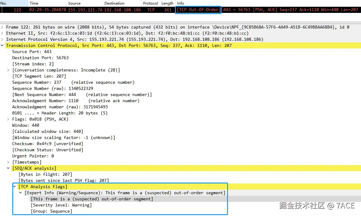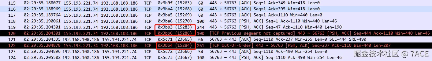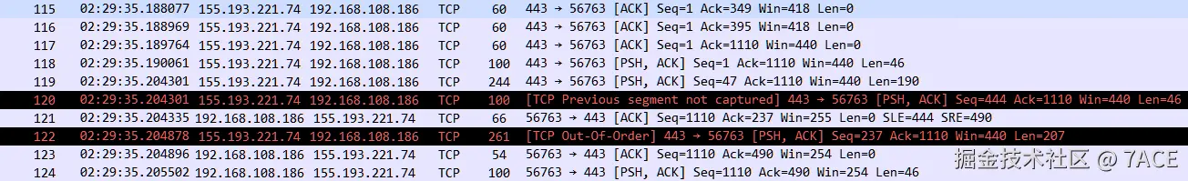 标准的 TCP 乱序场景,No.119 和 No.120 中间缺失一个 Seq 237 + Len 207 的数据分段,No.120 首先会提示 [TCP Previous segment not captured],之后 No.122 Seq 237 + Len 207 的数据包到来,满足乱序数据包的判断条件,标记成 [TCP Out-Of-Order] 。