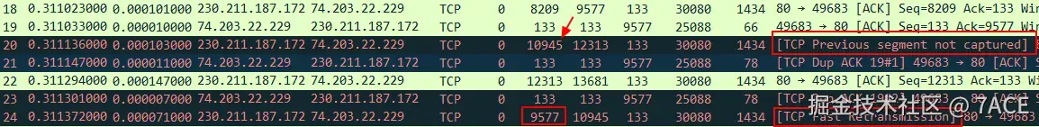 - 服务器所发的数据包 No.20 前丢了一个 TCP 分段 Seq 9577 ,所以 No.20 标记为