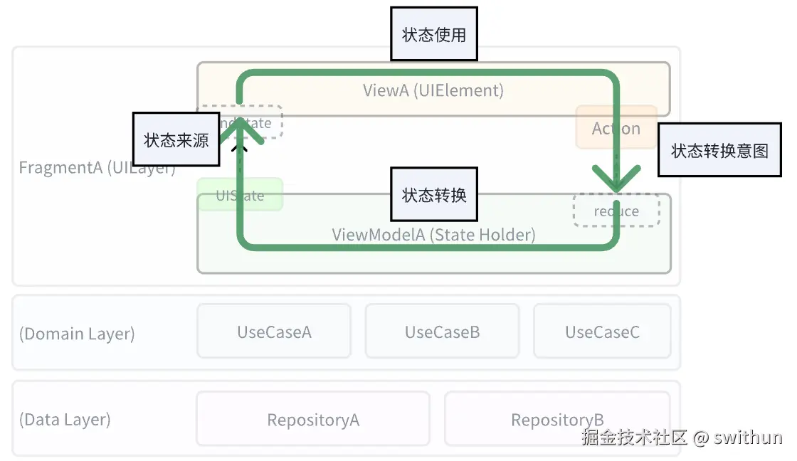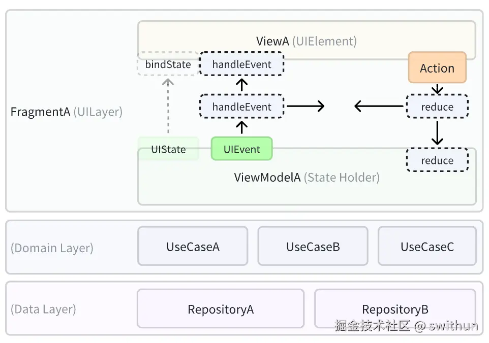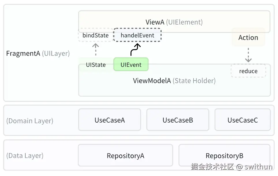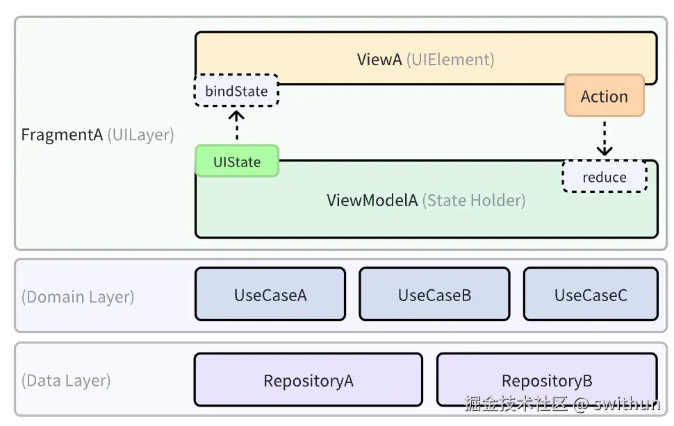 ViewModel的定位比在MVVM中更偏向于View层,所以将View层和ViewModel层统一作为UI layer,ViewModel中原本更偏向于数据层的逻辑处理被放在新增的Domain Layer。