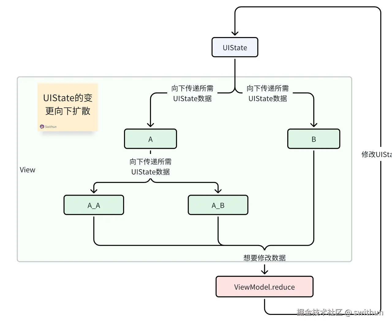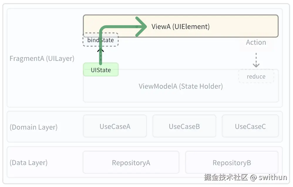 view自身不能直接更改自己显示内容,只能通过Action将修改的意图通知ViewModel,ViewModel修改uiState后view根据uiState刷新