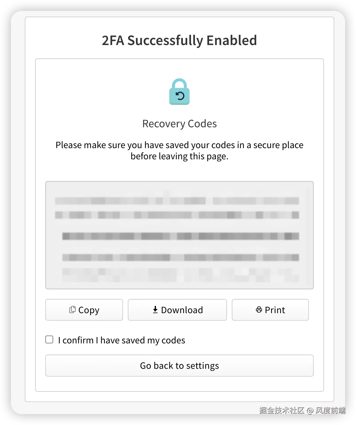 使用指纹确认后,我们的密钥就添加到了 icloud 中,npm 提示你 2FA 开启成功,并让你保护恢复代码。