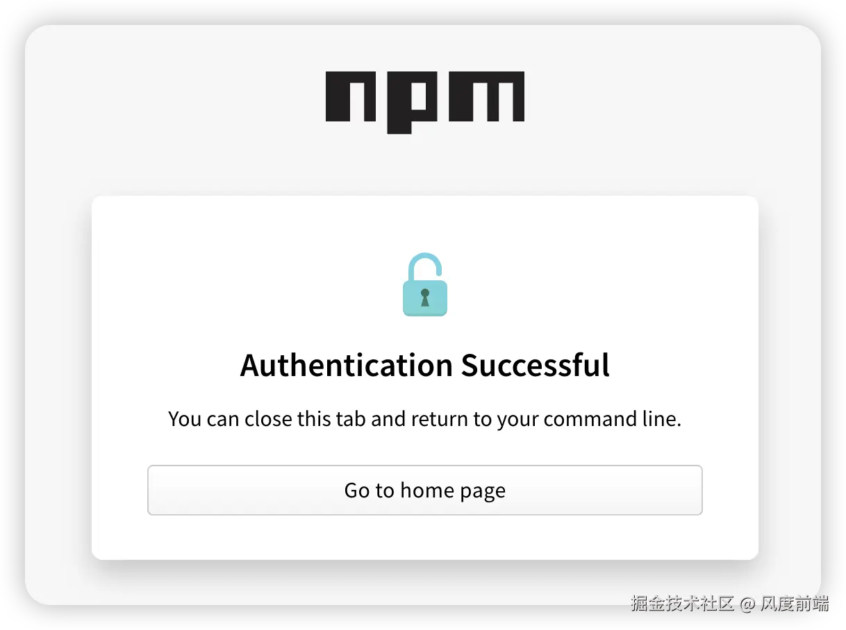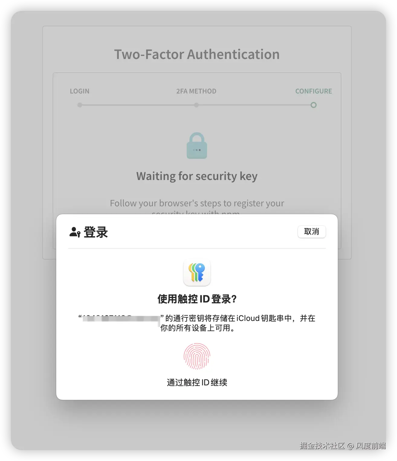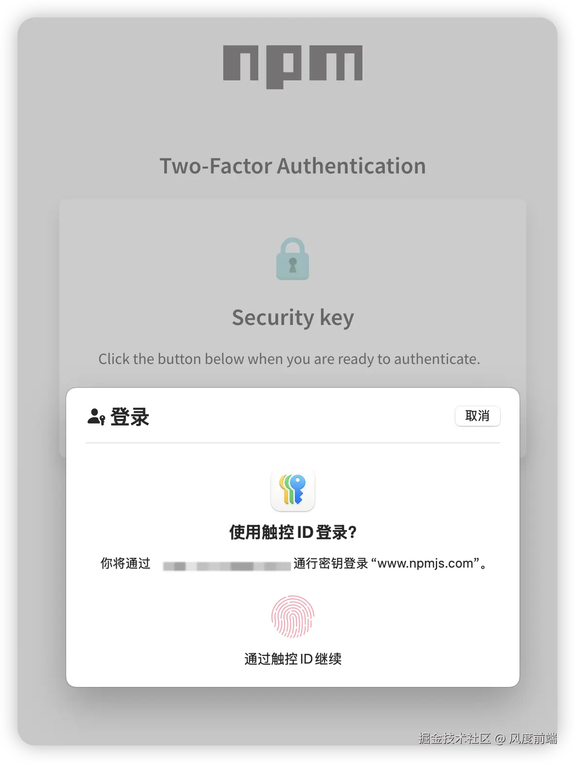 然后我们再次执行npm login,等你键入回车后就会自动打开浏览器跳转到 2FA 页面,确认过指纹后就可以成功在终端中登录 npm 账号了,这样就免去了每次查看邮箱了,整体发包的体验就好了很多。