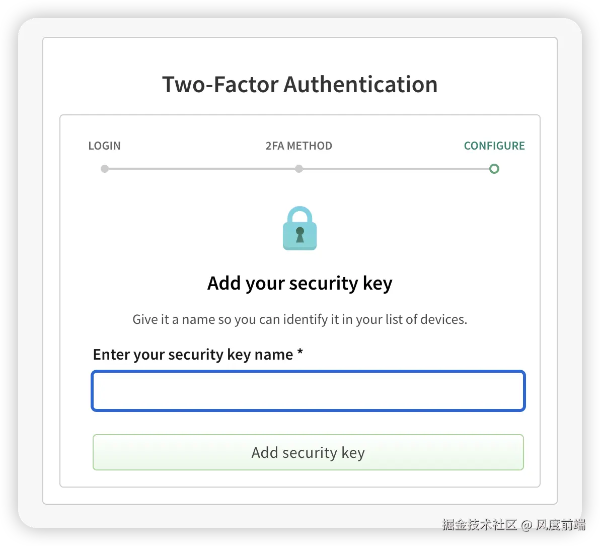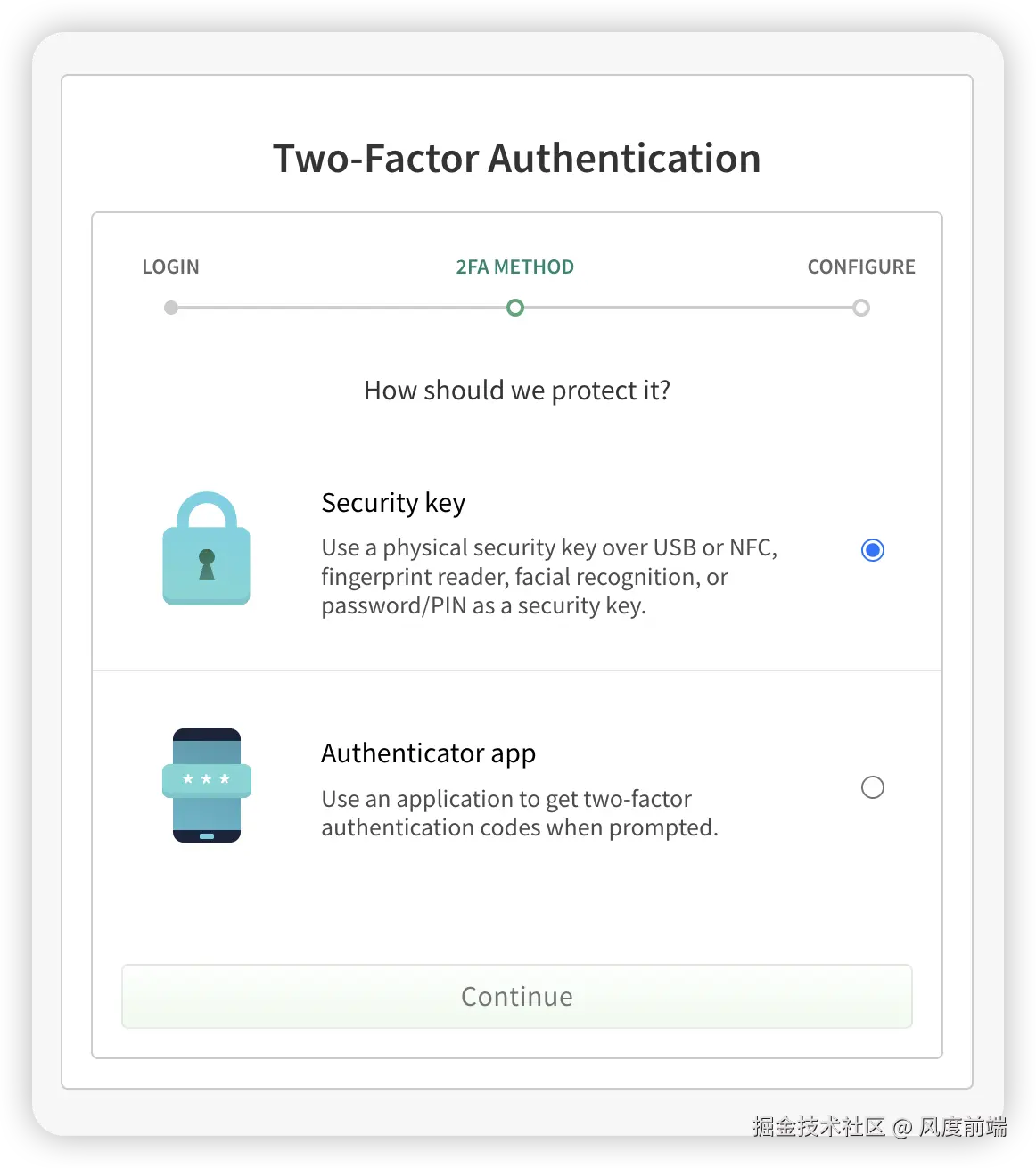 这里直接选择第一种方式,使用安全密钥,可以直接使用 apple 的 touchid 或者 windows hello 来验证。第二种方式是我过去用的,比较麻烦,需要下载额外的 app 然后查看基于时间的一次性验证码。