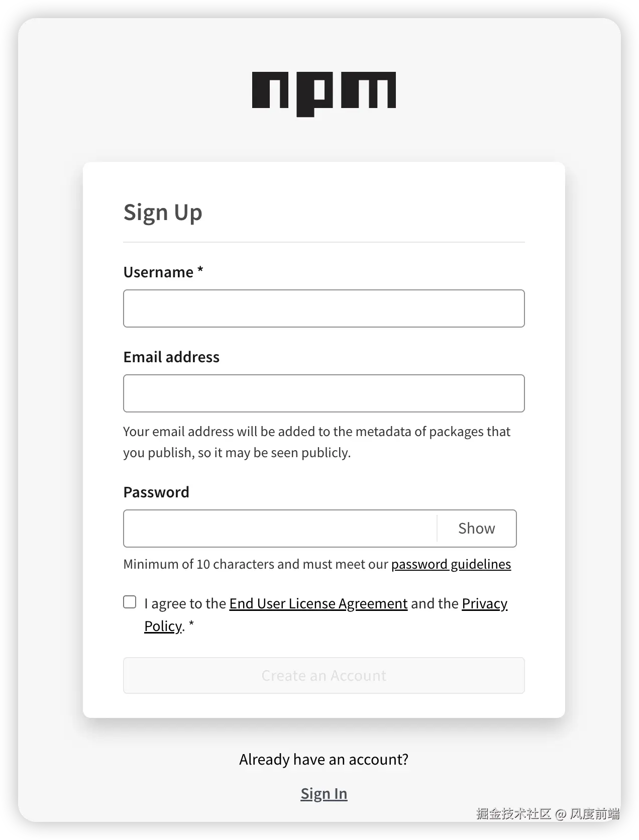 注册 npm 很简单,只需要用户名和邮箱,用户名起个自己喜欢的英文马甲名,rose、jack 之类的,这里要注意username是唯一的且不可修改,如果不小心拼错了,以后也只能将错就错的使用了。
