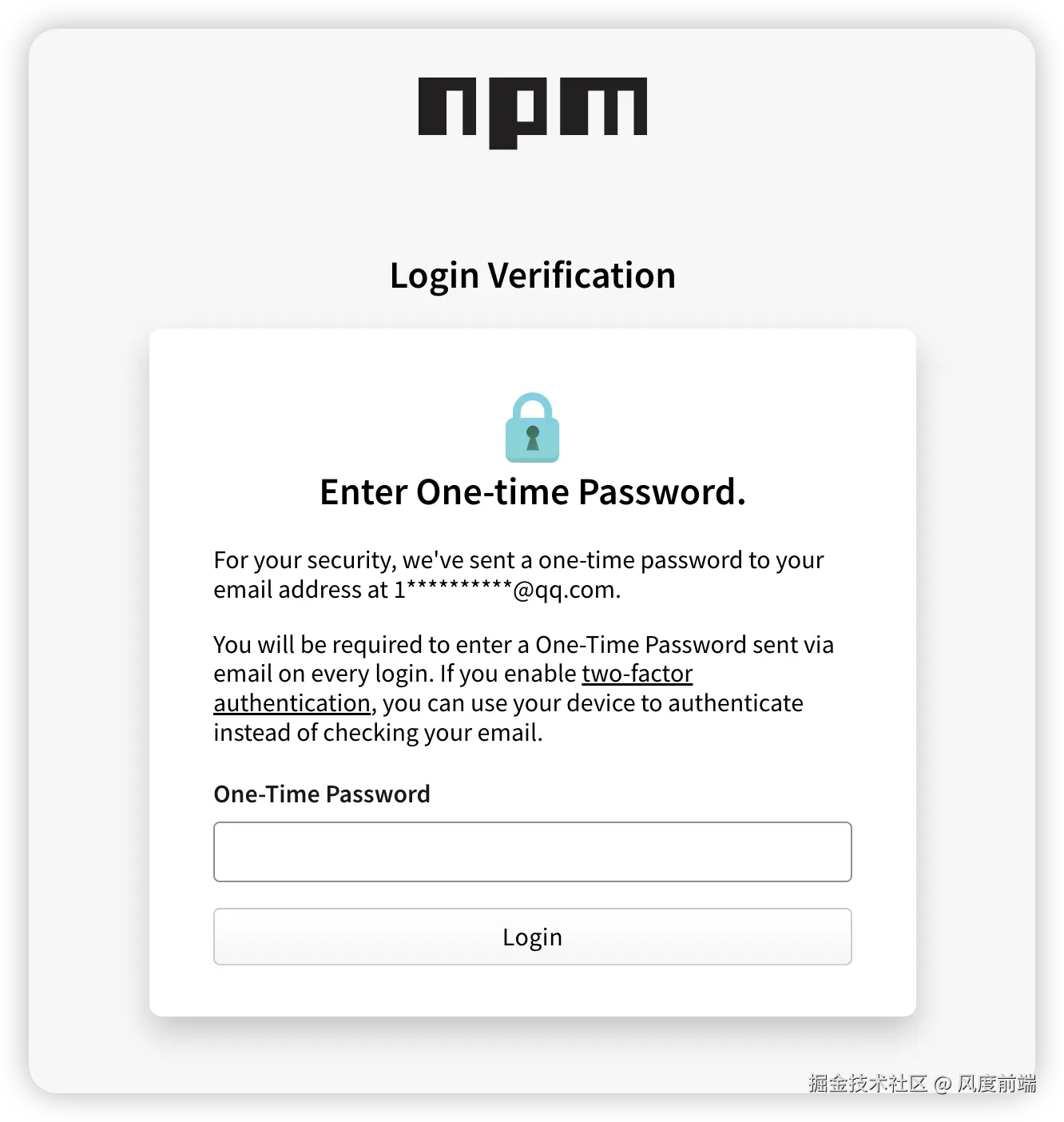 默认情况下,npm 为了你的账号安全考虑,每次登录账号都需要使用一次性密码验证自己,该密码会发送到你配置的电子邮件地址里。所以不论你是在网页端登录账号,还是通过命令行登录 npm 账号,都需要从邮箱收验证码。