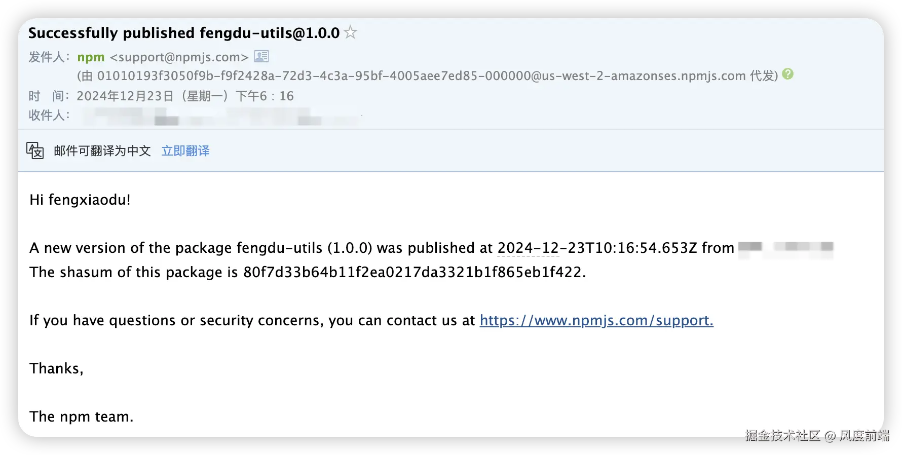 看到最后的+ fengdu-utils@1.0.0就说明自己的包发布成功了,于此同时你绑定的 npm 邮箱也会收到一封通知告知你成功的发布了自己的包。