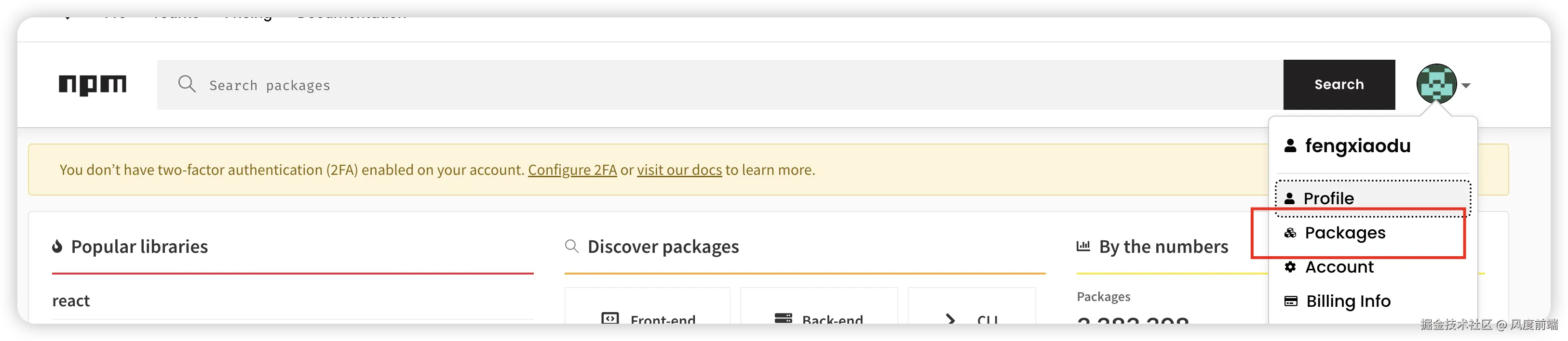 输入完验证码就后就进入到了 npm 的首页,此时你就完成了 npm 账号的注册,首页有个横幅提示你没有开启双因素认证,关于双因素认证这个我们稍后说,我们先进行第二步:创建项目