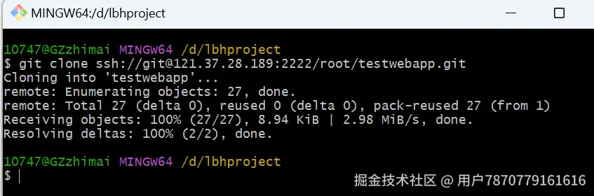 在公钥配置完成后,我们打开刚刚创建的项目,使用SSH克隆,复制链接,然后可以在本地将仓库克隆下来!