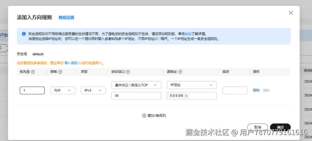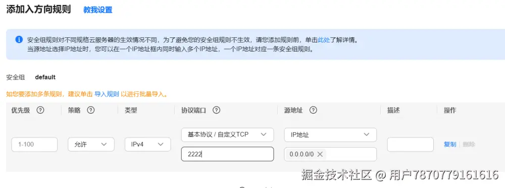 添加完80端口后,我们还要再添加一个2222的端口,用于ssh访问。
