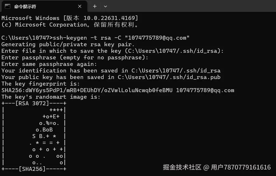 打开cmd 输入ssh-keygen -t rsa -C "******@qq.com"(换成你的邮箱)然后回车回车跳过设置密码等步骤。出现下图信息即公钥生成成功了