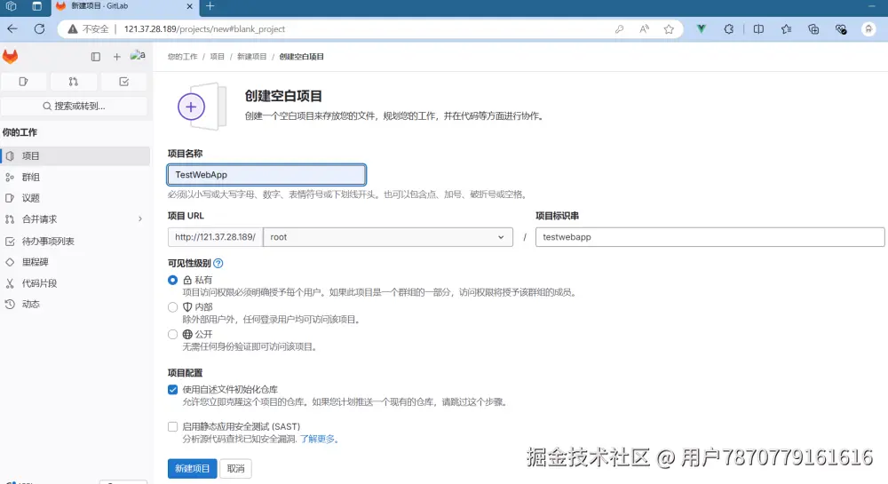1.输入GitLab实例的URL(例如我的是:http://121.37.28.189)。这是你的GitLab服务器的地址,GitLab Runner将与之通信以接收任务并报告结果。