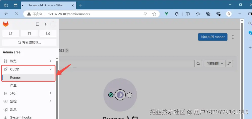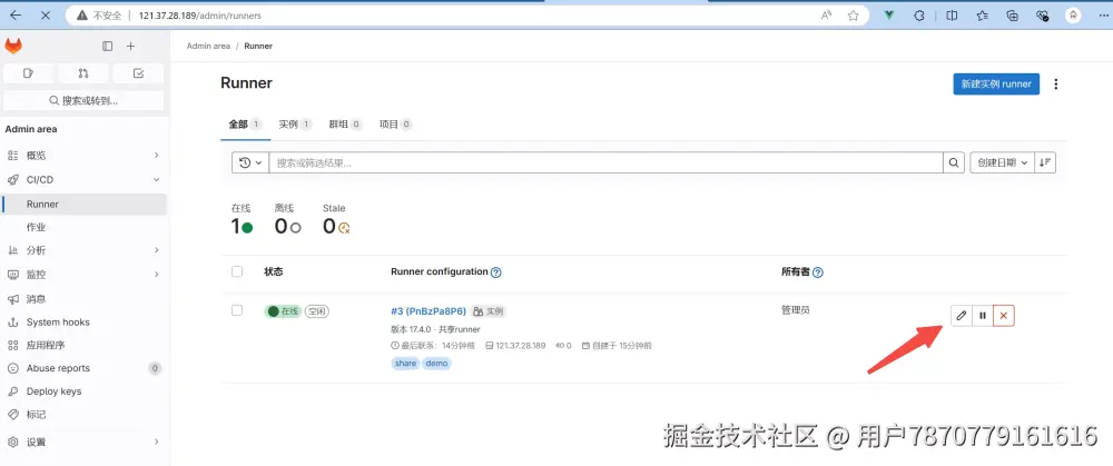 回到我们gitlab中的Runner界面,可以看到Runner下面有一个实例,且是在线状态,证明已经创建成功了!