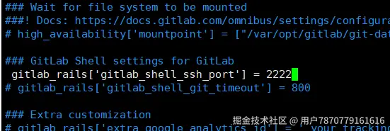 修改gitlab_rails['gitlab_shell_ssh_port'] 为 = 2222,因为上面docker run的时候,我们避免端口冲突,设置端口映射配置为--publish 2222:22(大约在698行位置)