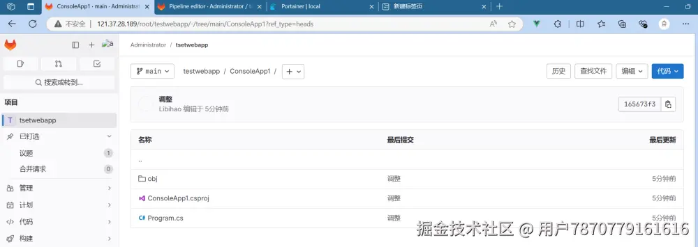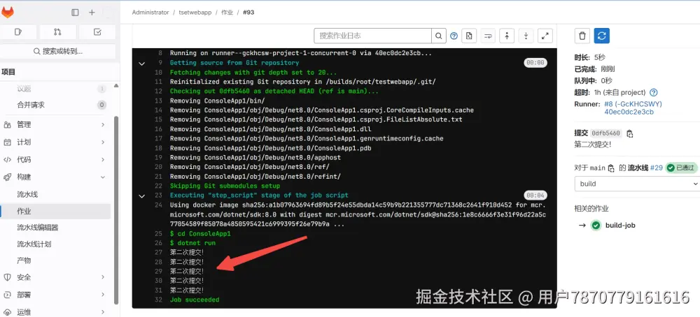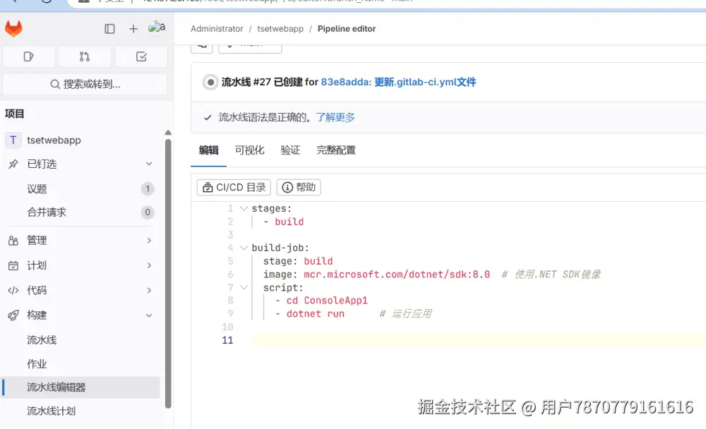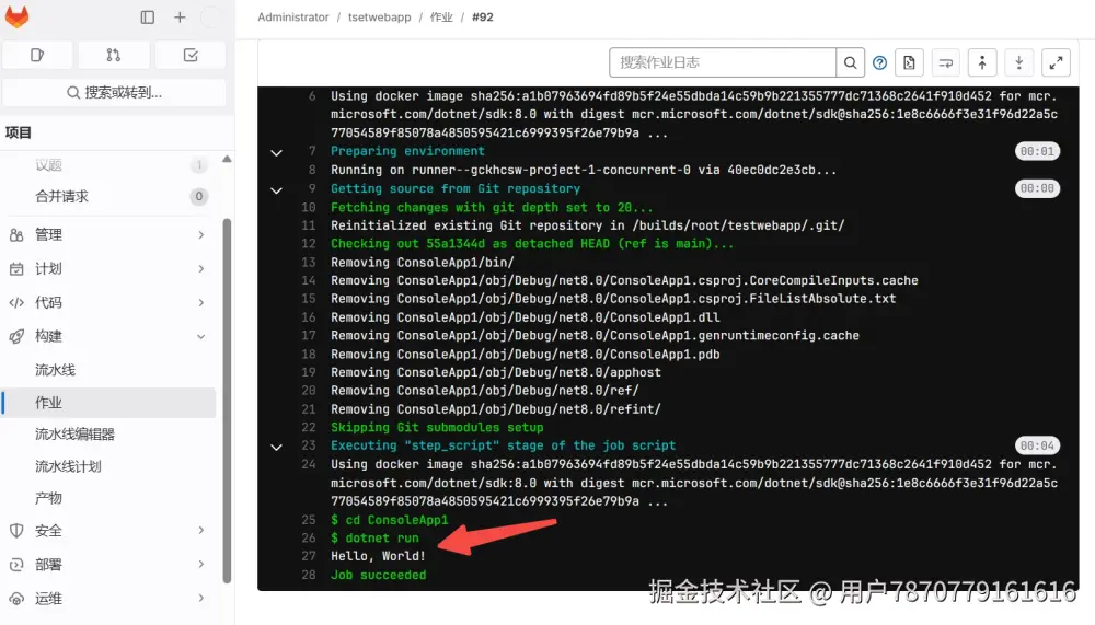 因为主要目的是测试提交代码自动部署,并且我的测试案例是控制台应用,因此我这里直接在第一阶段中使用.net 8.0的镜像运行项目!