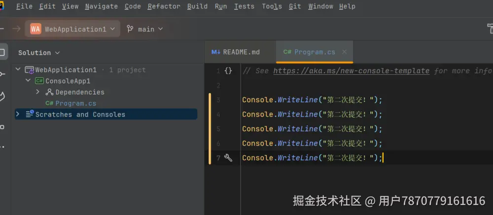 将代码克隆下来后,只有一个包含Readme.md的空文件夹,我们在此目录下新建一个c#控制台项目,用于测试,然后推送上去!