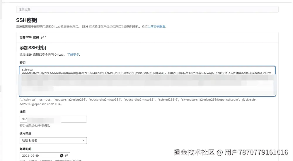 复制到gitlab的配置密钥界面中,保存,至此我们的公钥就添加成功了!