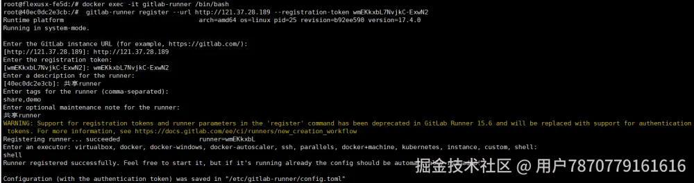 因为我们的GitLab Runner是部署在docker中,因此需要通过docker exec命令进入容器内部来执行gitlab-runner register命令