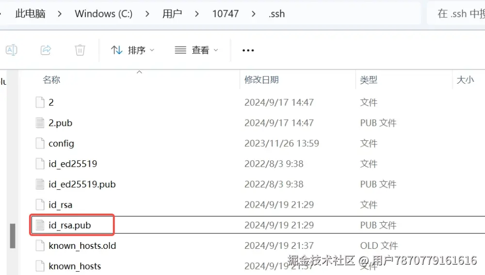 Git的SSH密钥通常存储在用户的~/.ssh目录下,在Windows中,这通常对应于C:\Users\Your-Username.ssh,其中Your-Username是你的Windows用户名。打开id_rsa.pub,复制里面的公钥。