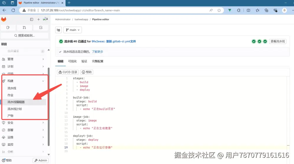 进入到我们创建的用于测试的项目中,打开“构建”下的流水线编辑器