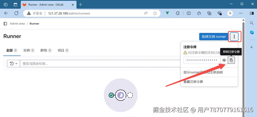 在Runner界面中,点击右上角的扩展标志,选择复制注册令牌,此令牌用于我们下面进行注册runner