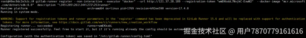 8.最后,将带有认证令牌的配置保存在"/etc/gitlab-runner/config.toml"文件中。这个文件包含了Runner的配置信息,包括与GitLab服务器通信所需的认证令牌和其他设置。