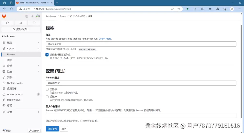4.为新注册的Runner添加标签,用逗号分隔,例如:"share,demo"。这些标签可以用于将Runner分配给特定的项目或任务组,以便它们只处理具有相应标签的任务。例如我这里新注册的Runner添加了"share,demo"这两个标签。这意味着这个Runner将只处理带有"share"或"demo"标签的CI/CD任务。如果某个项目的.gitlab-ci.yml文件中指定了这些标签,那么该项目的构建、测试等任务就会由这个Runner来执行