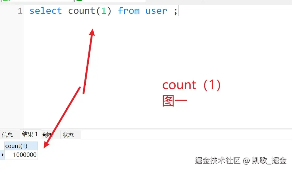 凯歌: 哈哈哈,非常正确那!count(1)就是统计表里面 有多少行 的结果是 1