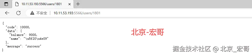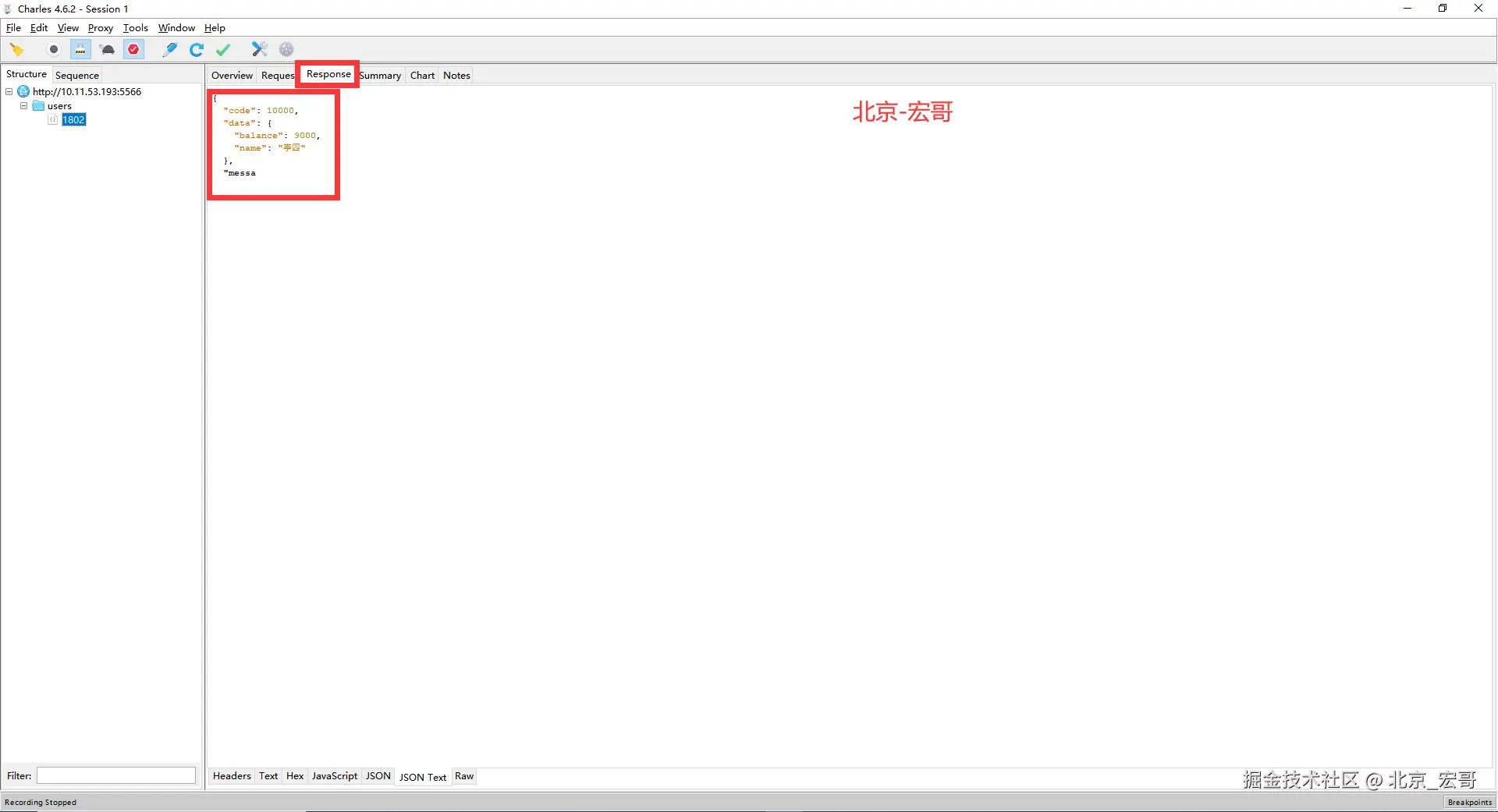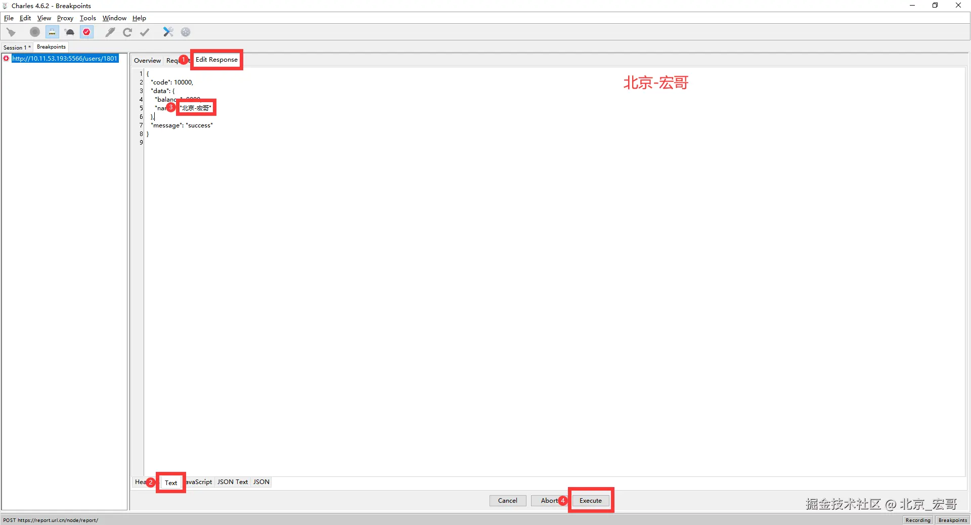1.按照前边的步骤进行响应的断点设置,在接到服务器的响应之后,进行响应的断点拦截,将响应结果:张三 修改成 北京-宏哥,预期响应结果为返回:北京-宏哥 的账户信息。如下图所示: