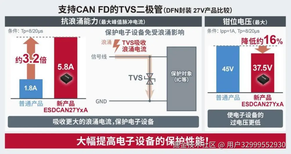 新产品通过优化元件结构,将引脚间电容* 3降至最大3.5pF,可防止高速通信时的信号劣化。另外还实现了出色的抗浪涌特性,大大提高了车载环境中电子设备的保护性能。例如,DFN1010封装的支持27V的 新产品,与支持CAN FD的同等普通产品相比,抗浪涌能力* 4提高了约3.2倍,钳位电压* 5也降低了约16%。 这可以有效地保护车载ECU等昂贵且对浪涌敏感的电子设备,即使在严苛的车载环境中也能提供高可靠性。