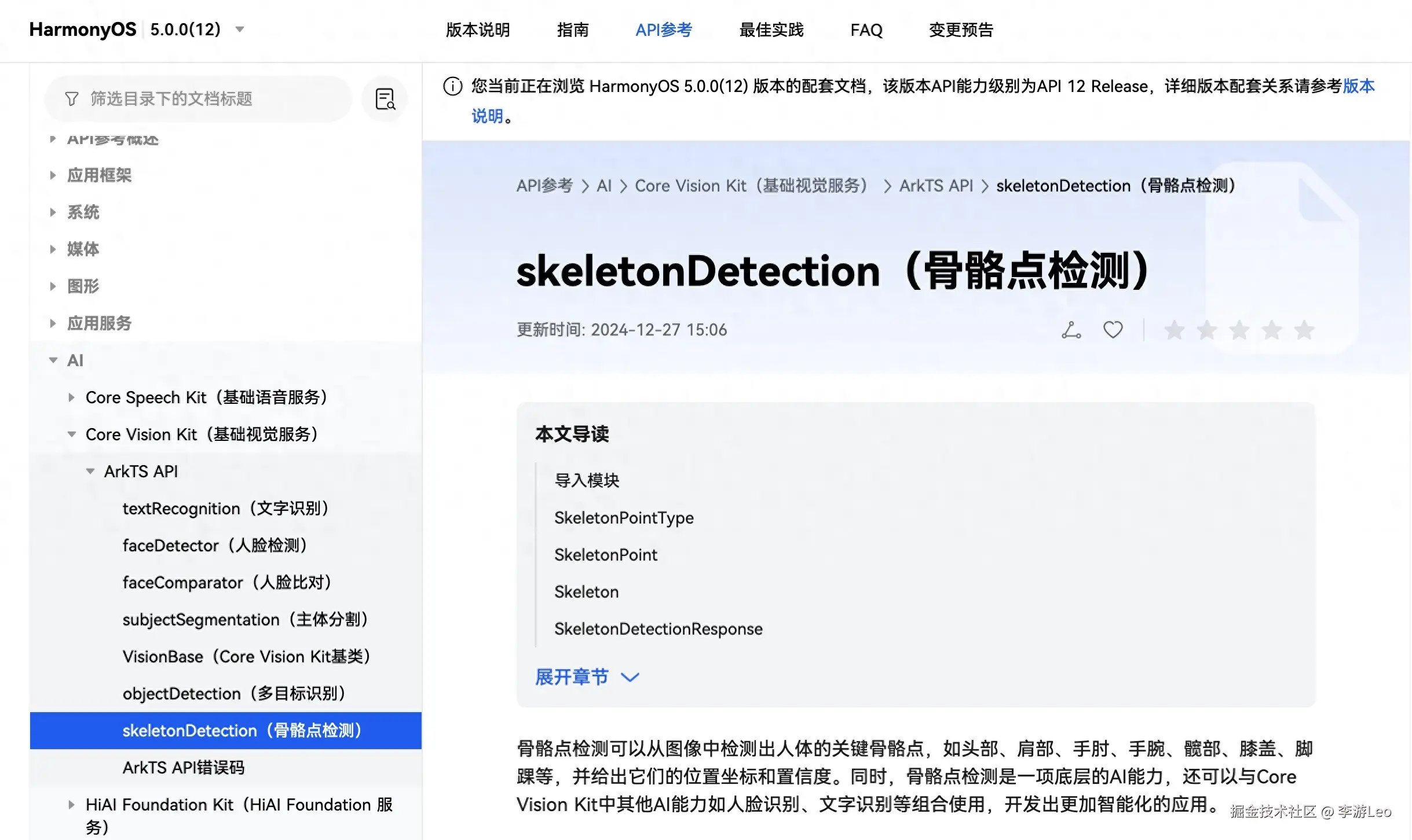 骨骼点检测技术是一项强大的AI能力,能够从图片中识别出人体的关键骨骼点位置,如头部、肩部、手肘等。这些信息在人体姿态分析、动作捕捉、健身指导等场景中有着广泛应用。我决定深入学习HarmonyOS Next最新版本API 13中的Skeleton Detection API,并开发一个简单的骨骼点检测应用。