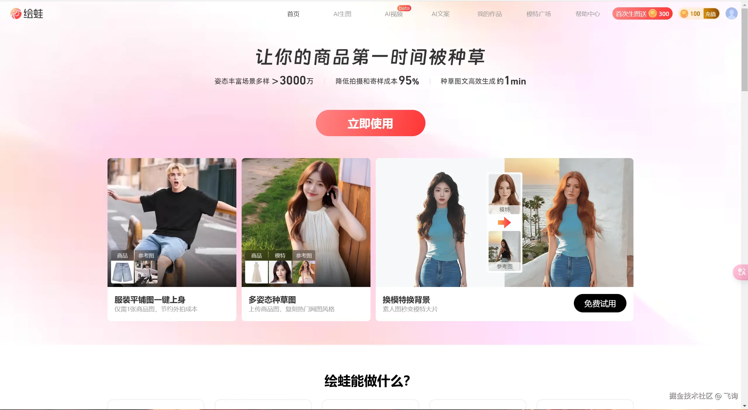 专业的AI 电商类的网站,包含生成 模特图、AI生成视频、AI 生成文案、智能换背景等等。