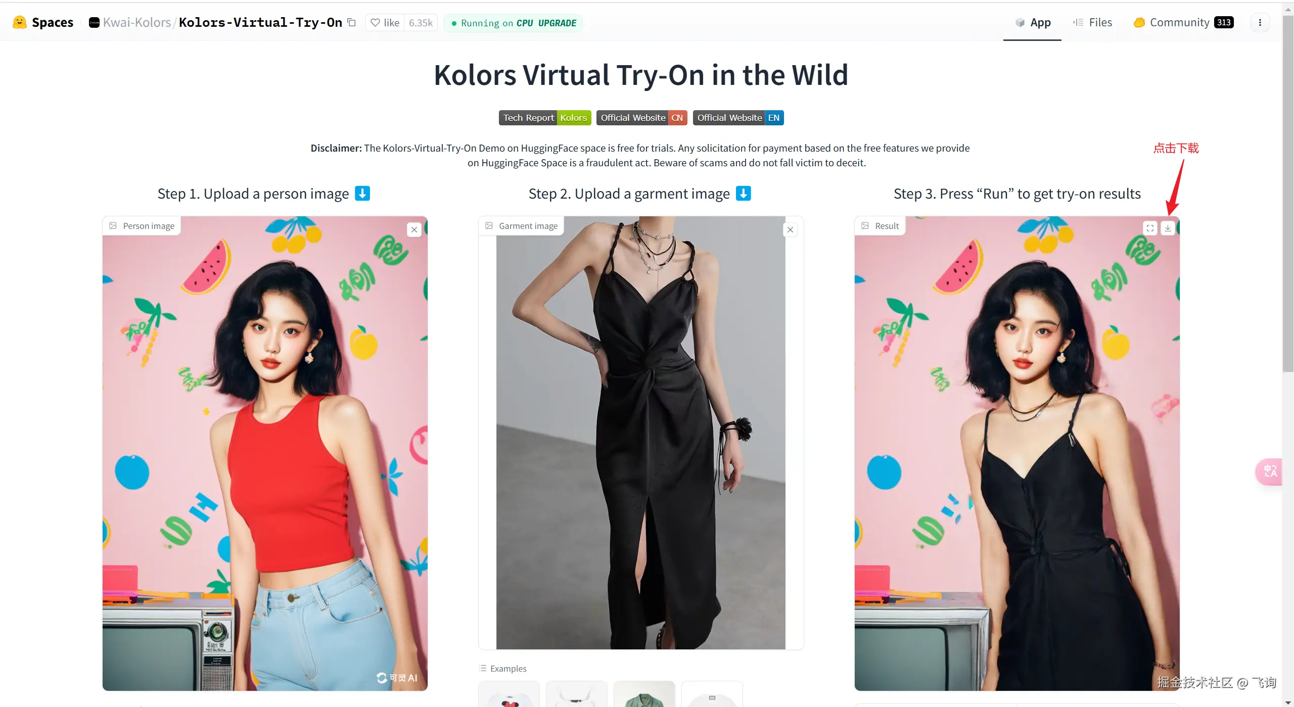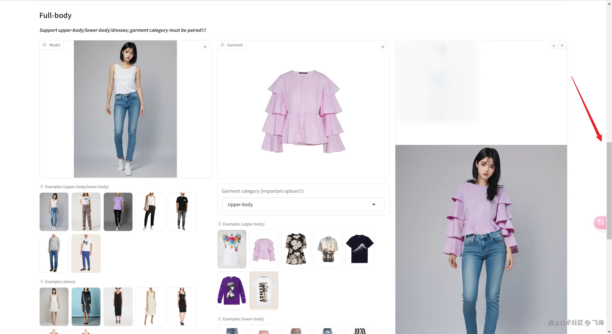第一张图片是模特,第二张图片是衣服,第三张图片是生成后的结果