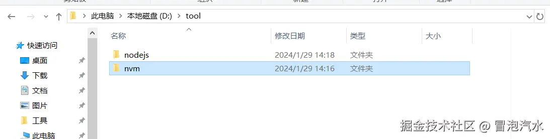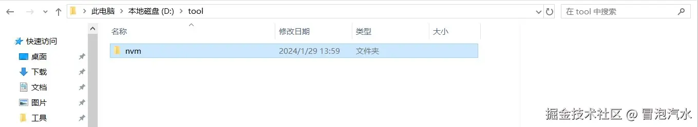 此时查看你的 tool 文件夹,里面必须只有 nvm 这一个文件夹