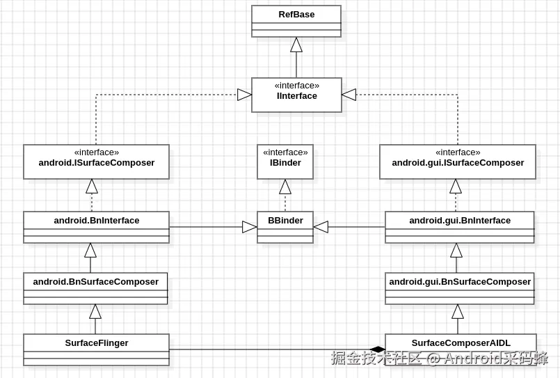 surfaceflinger即作为一个独立进程,也是进行IPC的系统服务。surfaceflinger中通过两个接口来实现IPC通信——ISurfaceComposer和gui::ISurfaceComposer,其类图表示如下: