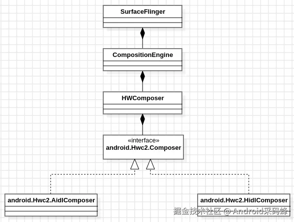 HWComposer:定义了SurfaceFlinger和HAL Composer通信的所有方法的顶层接口;impl::HWComposer:HWComposer的具体实现类;Hwc2::Composer:代表实际的HAL composer的抽象接口,从Android 7.0之后由HWC切到了HWC2;android::Hwc2::AidlComposer:实现了Hwc2::Composer接口、以AIDL方式进行IPC的包裹类;android::Hwc2::HidlComposer:实现了Hwc2::Composer接口、以HIDL方式进行IPC的包裹类。